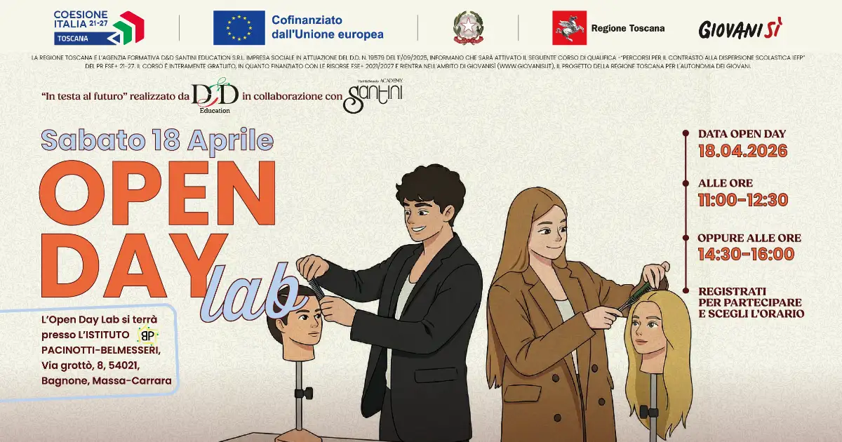 Sabato 18 aprile, presso l’IIS Pacinotti – Belmesseri di Bagnone, si terrà l’Open Day Lab del percorso triennale di Istruzione e Formazione Professionale (IeFP) “In testa al futuro”, la scuola triennale gratuita per minorenni che forma per diventare parrucchieri.